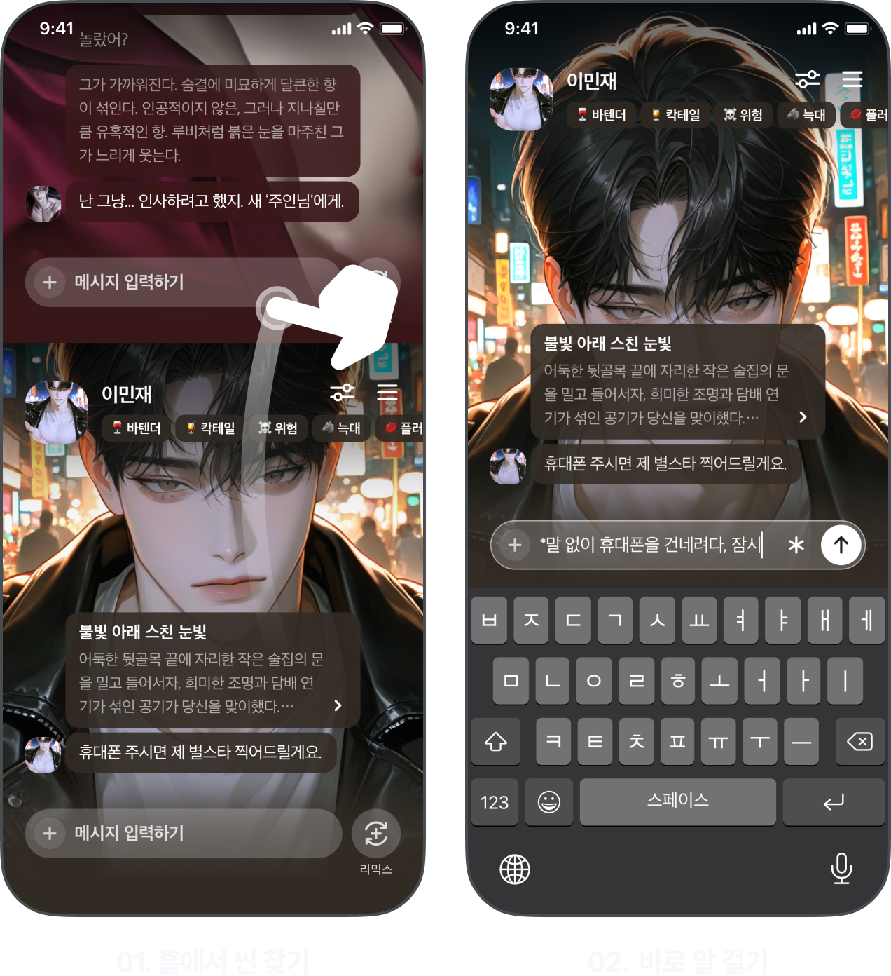 λ§μμ λλ μ¬μ΄ λμ€λ©΄ κ·Έ μ리μμ λ°λ‘ λ§μ κ±Έ μ μμ΄μ. νλ©΄ μλμͺ½ "λ©μμ§ μ λ ₯νκΈ°" μ°½μ μ°κ³ μ μ‘νλ©΄, μΊλ¦ν°κ° λ°λ‘ λ΅ν΄μ€μ.
